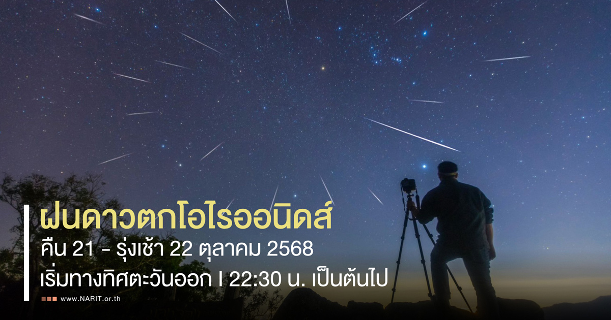 ฝนดาวตกโอไรออนิดส์ ประจำปี 2568 คืนวันที่ 21 ตุลาคม ตั้งแต่เวลา 22.30 น. ไปจนถึงรุ่งเช้า ปีนี้ไร้แสงจันทร์รบกวน หากฟ้าใสไร้ฝน ลุ้นชมด้วยตาเปล่าได้ทั่วประเทศ