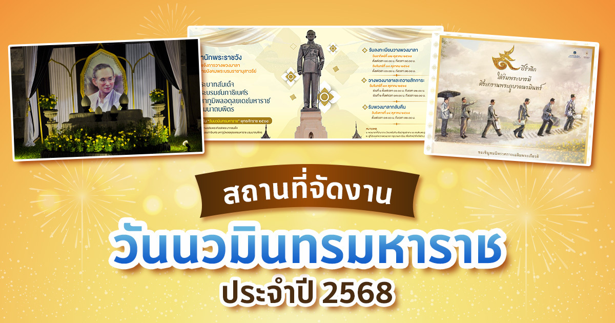 วันนวมินทรมหาราช 2568 นี้ ชวนร่วมรำลึกในพระมหากรุณาธิคุณของในหลวงรัชกาลที่ 9 ไปพร้อมกันทั่วประเทศ พร้อมร่วมกิจกรรมจิตอาสาและงานจัดแสดงต่าง ๆ ที่อบอวลด้วยความรัก ความภักดี และความอบอุ่นของหัวใจคนไทยทั้งแผ่นดิน ^ ^