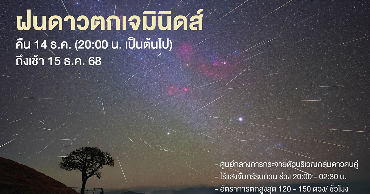 ชมความงดงามบนท้องฟ้ายามค่ำคืนกับ “ฝนดาวตกเจมินิดส์” คืนวันที่ 14 - รุ่งเช้า 15 ธันวาคม 2568 เพียงเลือกพื้นที่โล่ง มืดสนิท ปราศจากแสงรบกวน ก็สามารถชมได้ด้วยตาเปล่าทุกภูมิภาคทั่วไทย