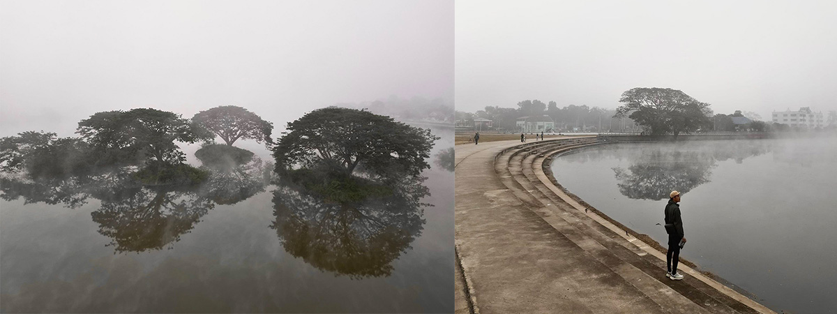 หนองน้ำครก น่าน ต้นจามจุรีใหญ่กลางผืนน้ำ และสายหมอกบาง ๆ ยามเช้า บรรยากาศเรียบง่ายแต่สวยละมุน ถ่ายรูปเช็กอินก็เก๋