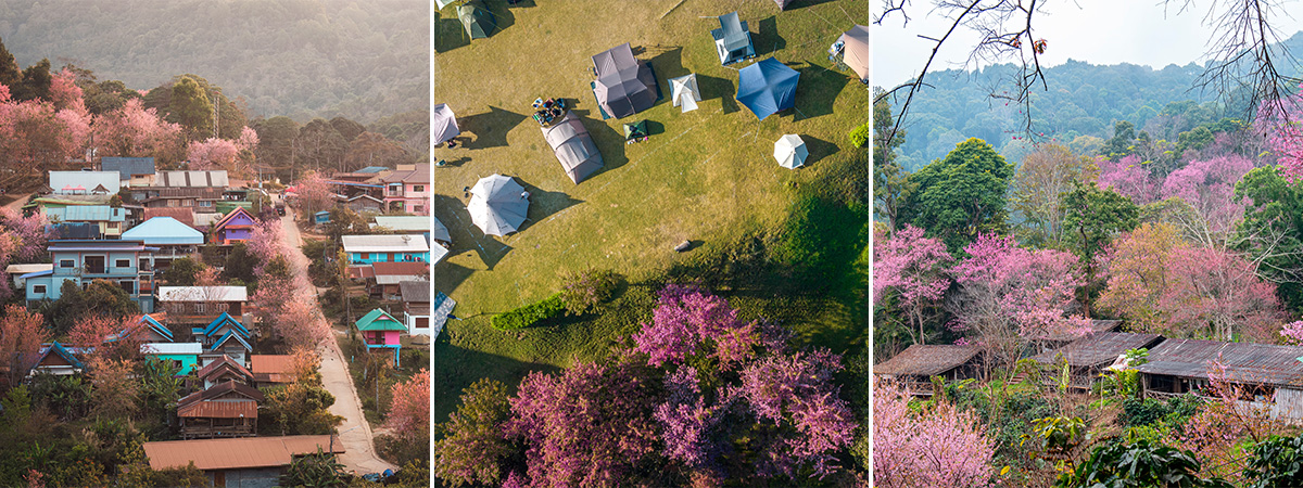 อีกหนึ่งจุดหมายหน้าหนาวที่ชวนให้แวะไปสัมผัสเสน่ห์ธรรมชาติอย่างใกล้ชิด โดยเฉพาะในช่วงที่ดอกนางพญาเสือโคร่งเริ่มผลิบานแต้มสีชมพูอ่อนท่ามกลางผืนไร่ชาสีเขียวเรียงตัวเป็นขั้นบันได บรรยากาศโดยรอบโอบล้อมด้วยภูเขาและอากาศหนาวเย็น ทำให้การเดินเล่นชมวิวหรือถ่ายภาพเต็มไปด้วยความสดชื่นและผ่อนคลาย ใครที่ขึ้นมาเที่ยวดอยอ่างขางในช่วงฤดูหนาว ไม่ควรพลาดการแวะไร่ชา 2000 เพื่อดื่มด่ำภาพความงามของซากุระเมืองไทย พร้อมชมวิวภูเขาสลับซับซ้อนในมุมที่ทั้งสงบและละมุนใจ