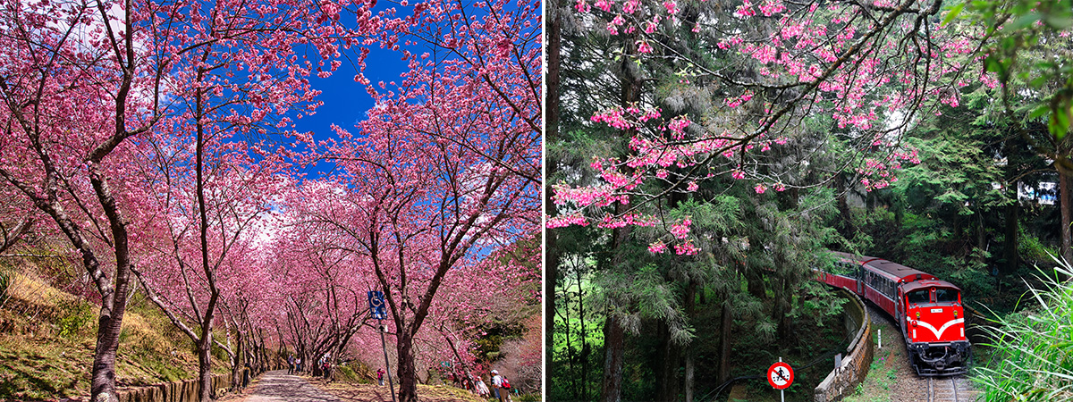 - อุทยานแห่งชาติอาลีซาน (Alishan National Park) เป็นพิกัดคลาสสิกที่สุด ไฮไลต์คือการถ่ายรูป รถไฟสีแดง วิ่งผ่านอุโมงค์ดอกซากุระสายพันธุ์โยชิโนะ