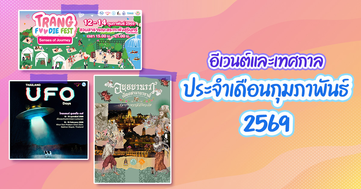 เดือนกุมภาพันธ์ 2569 ยังมีอีเวนต์และเทศกาลน่าเที่ยวอีกมากให้เลือก ใครถูกใจงานไหน อย่าลืมปักหมุดแล้วออกไปเก็บบรรยากาศดี ๆ เพราะช่วงเวลาดี ๆ แบบนี้ มีให้สัมผัสไม่นาน ^ ^