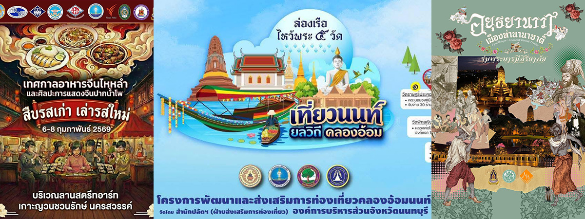 - อยุธยานาวา เมืองท่านานาชาติ ร่มพระบารมีสิริยาลัย (วันที่ 1-28 กุมภาพันธ์ 2569) กิจกรรมท่องเที่ยวโบราณสถานยามค่ำคืนที่ปังที่สุดในนครประวัติศาสตร์พระนครศรีอยุธยา ณ วัดไชยวัฒนาราม วัดพระราม พระราชวังจันทรเกษม และพิพิธภัณฑสถานแห่งชาติ เจ้าสามพระยา