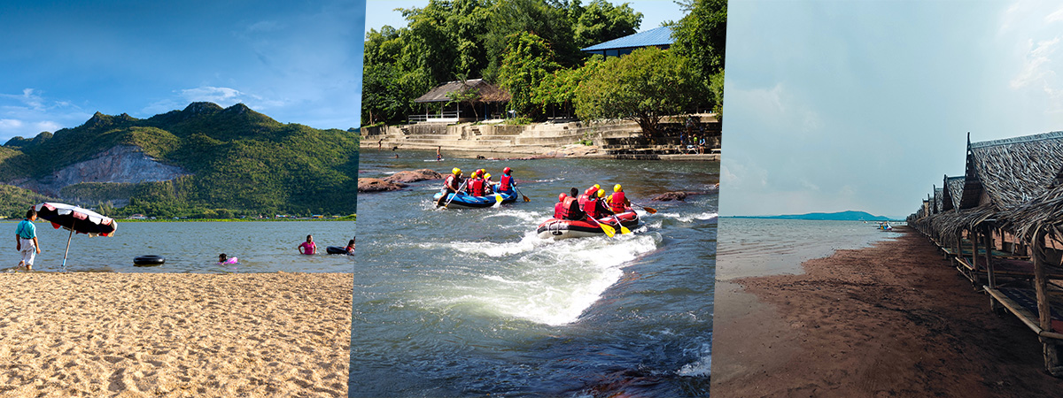 จุดพักผ่อนริมน้ำใกล้วัดเขาดิน ที่นี่ถูกเนรมิตริมฝั่งแม่น้ำแม่กลองให้กลายเป็นชายหาดน้ำจืดที่กว้างขวาง บรรยากาศชิลเหมือนยกทะเลมาไว้ในเมืองกาญจน์เลยทีเดียว จุดเด่นอยู่ที่น้ำใสไหลเย็นและตื้นปลอดภัย เหมาะกับการลงเล่นน้ำหรือพาลูกหลานมาทำกิจกรรมริมแก่งน้ำได้ตลอดทั้งวัน นอกจากนี้ยังมีบริการเช่าห่วงยาง เจ็ทสกี และร้านอาหารริมน้ำให้เลือกสั่งท่ามกลางลมพัดเย็นสบาย แนะนำให้มาช่วงเย็น ๆ จะได้ไม่ร้อนจนเกินไป ใครไม่รู้จะไปเที่ยวคลายร้อนที่ไหน ลองแวะมากันดู