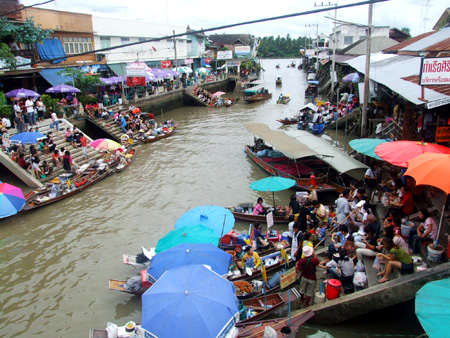 อัมพวา เป็นแหล่งท่องเที่ยวที่ขึ้นชื่อของจังหวัดสมุทรสงคราม บรรยากาศของที่นี่จะร่มรื่นไปด้วยสวนผสมริมน้ำ โดยเราสามารถหลบร้อนไปลงเรือล่องคลองชมสวน สัมผัสวิถีชีวิตชาวบ้าน ชิมผลไม้ต่างๆ หรือซื้อกลับไปกินบ้านให้ชื่นฉ่ำใจก็ได้ไม่มีใครว่า หรือจะเลือกปั่นจักรยานเช่าถีบไปคู่ขนานกับท้องร่อง ก็ได้อรรถรสอีกแบบหนึ่ง และตกเย็นการท่องเที่ยวยังไม่จบสิ้น และเป็นไฮไลต์ของการเยือนอัมพวาเลยทีเดียว นั่นคือ การชมและชิมอาหารหลากหลายที่"ตลาดน้ำอัมพวา" เป็นตลาดริมคลอง ตั้งอยู่ใกล้วัดอัมพวันเจติยาราม ซึ่งเปิดทุกวันศุกร์ - อาทิตย์ ในช่วงเวลาเย็นตั้งแต่ช่วงเวลา 12.00 - 20.00 น. ในคลองอัมพวาจะมีพ่อค้าแม่ค้าพายเรือขายอาหารและเครื่องดื่ม บรรยากาศสบาย ๆ มีเพลงฟัง จากเสียงตามสายของชาวชุมชน ประชาชนสามารถเดินเที่ยวชมตลาดหาซื้ออาหารรับประทานและเช่าเรือไปเที่ยวชมดูหิงห้อยในยามค่ำคืนได้