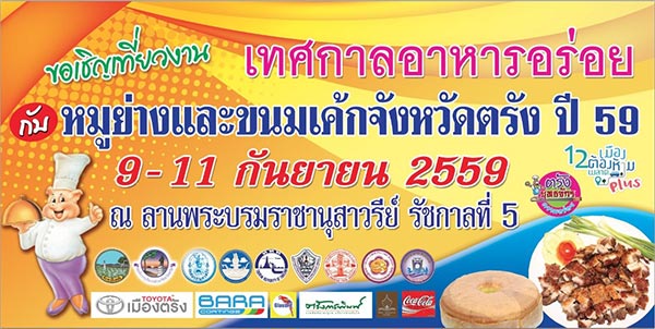 จังหวัดตรัง โดยสำนักงานการท่องเที่ยวและกีฬาจังหวัดตรัง การท่องเที่ยวแห่งประเทศไทย (ททท.) สำนักงานตรัง หอการค้าจังหวัดตรัง ร่วมกับชมรมผู้ประกอบการหมูย่างจังหวัดตรัง และชมรมผู้ประกอบการขนมเค้กจังหวัดตรัง กำหนดจัดงาน "เทศกาลอาหารอร่อย กับ หมูย่างและขนมเค้กจังหวัดตรัง" ประจำปี 2559 กับแนวคิด "ตรังเมืองต้องห้ามพลาด...ยุทธจักรความอร่อย" ระหว่างวันที่ 9-11 กันยายน 2559 ณ ลานพระบรมราชานุสาวรีย์ รัชกาลที่ 5 จังหวัดตรัง