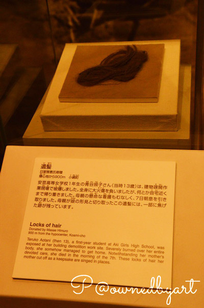 ปอยผม บริจาคโดย มาซาเอะ ฮิมุโระ (Masae Himuro) เทรุโกะ อะโอะทานิ (Teruko Aotani) อายุ 13 ปี โดนระเบิดระหว่างงานรื้อถอนอาคาร มีบาดแผลเผาไหม้ฉกรรจ์ทั้งตัว แต่ยังอุตส่าห์กลับบ้านจนได้ แม่ของเทรุโกะพยายามดูแลอย่างดี แต่เธอก็เสียชีวิตในเช้าวันรุ่งขึ้น แม่ของเธอจึงตัดผมส่วนหนึ่งเก็บไว้เป็นอนุสรณ์แด่ลูกสาวผู้ล่วงลับ