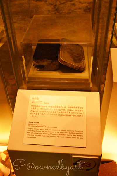 กล่องข้าวกลางวัน บริจาคโดย ชิเงโกะ โอริเม็ง (Shigeko Orimen) ชิเงรุ โอริเม็ง (Shigeru Orimen) เด็กมัธยมต้น โดนระเบิดระหว่างงานรื้อถอนอาคาร ในที่สุดเช้าวันที่ 9 สิงหาคม แม่ของเขาจึงตามพบร่างลูกชายซึ่งมีกล่องข้าวอยู่ข้างใต้ กล่องข้าวที่ชิเงรุไม่มีวันได้กิน