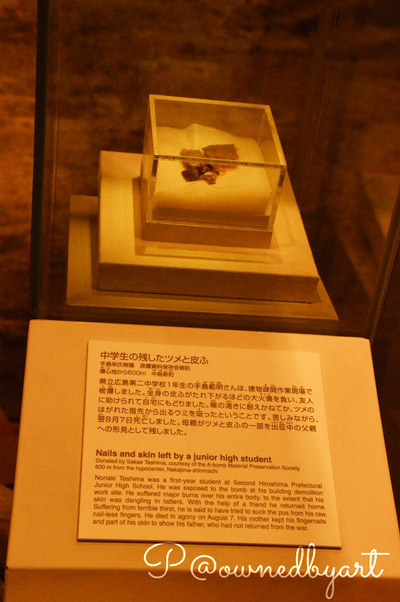 เล็บและผิวหนัง บริจาคโดย ซากาเอะ เทชิมะ (Sakae Teshima) เอื้อเฟื้อจาก A-bomb Material Preservation Society โนริอะกิ เทชิมะ (Noriaki Teshima) เด็กมัธยมต้น โดนระเบิดระหว่างงานรื้อถอนอาคาร มีบาดแผลไฟไหม้ไปทั่วทั้งตัว ผิวหนังลอกออกเป็นชิ้นเล็กชิ้นน้อย แต่เพื่อนก็ช่วยพาโนริอะกิกลับบ้าน มีคนเล่าว่าโนริอะกิกระหายน้ำมากจนกระทั่งพยายามจะกินหนองที่นิ้วมือซึ่งไม่มีเล็บเข้าไป ในที่สุดโนริอะกิก็เสียชีวิตด้วยความทรมานในวันถัดมา แม่ของเขาตัดเล็บและผิวหนังบางส่วนออกเพื่อเก็บไว้ให้พ่อของโนริอะกิดู...พ่อซึ่งไม่ได้กลับมาจากสงคราม
