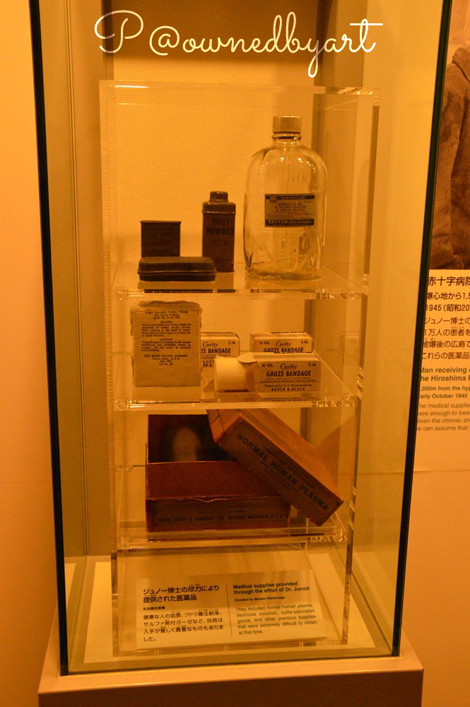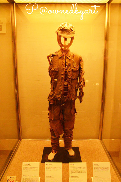 เครื่องแบบนักเรียน : บริจาคโดย โยชิโอะ ชิคาชิเงะ (Yoshio Chikashige) ฮิโระอากิ อุเนะ อายุ 12 ปี โดนระเบิดระหว่างเดินทางไปเรียนที่โรงเรียนมัธยมต้นฮิโระชิมะ ครอบครัว คือ คุณแม่ฮานะ และพี่สาวโยชิโอะ ออกเดินทางจากบ้านในคาโมะ (Kamo) เพื่อมาตามหาฮิโระอากิ คาดว่าน่าจะไม่พบศพฮิโระอากิ จึงได้เก็บเครื่องแบบนักเรียนเอาไว้เป็นความทรงจำแทน (รูปภาพบังไปส่วนหนึ่งทำให้เล่าได้ไม่หมดครับ)